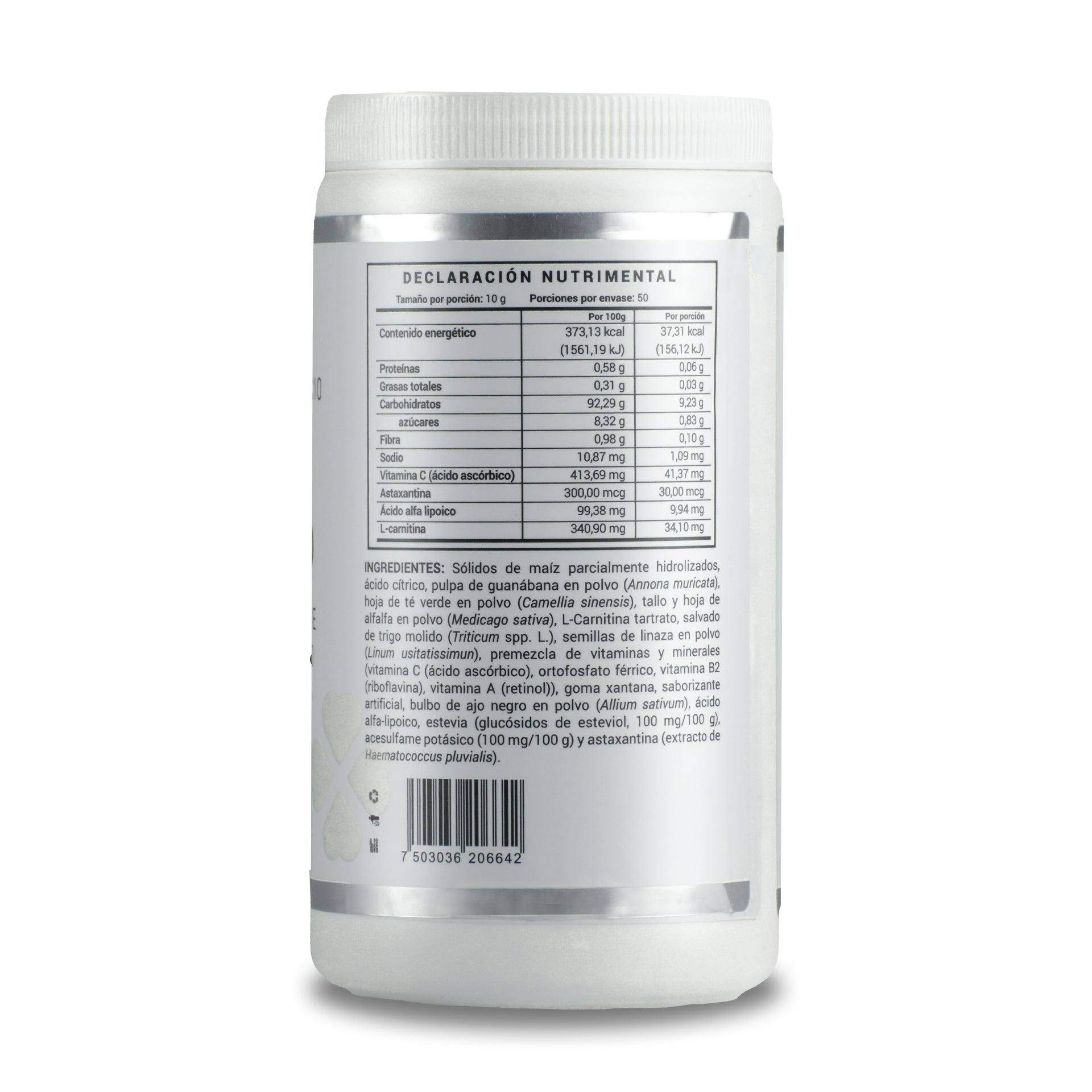 Los ingredientes clave incluyen bulbo de ajo negro, que ofrece beneficios antioxidantes y cardiovasculares; pulpa de guanábana, rica en antioxidantes que refuerzan el sistema inmunológico; hoja de té verde, que mejora el metabolismo y la quema de grasa; tallo y hoja de alfalfa, que aportan minerales y apoyan la detoxificación; semillas de linaza, ricas en fibra y omega-3, que favorecen la salud digestiva y cardiovascular; ácido alfa-lipoico, que protege las células y apoya el metabolismo; astaxantina, un potente antioxidante beneficioso para la piel y los ojos; una mezcla de vitaminas y minerales que refuerzan el sistema inmune; y L-carnitina tartrato, que transforma las grasas en energía para mejorar el rendimiento físico.