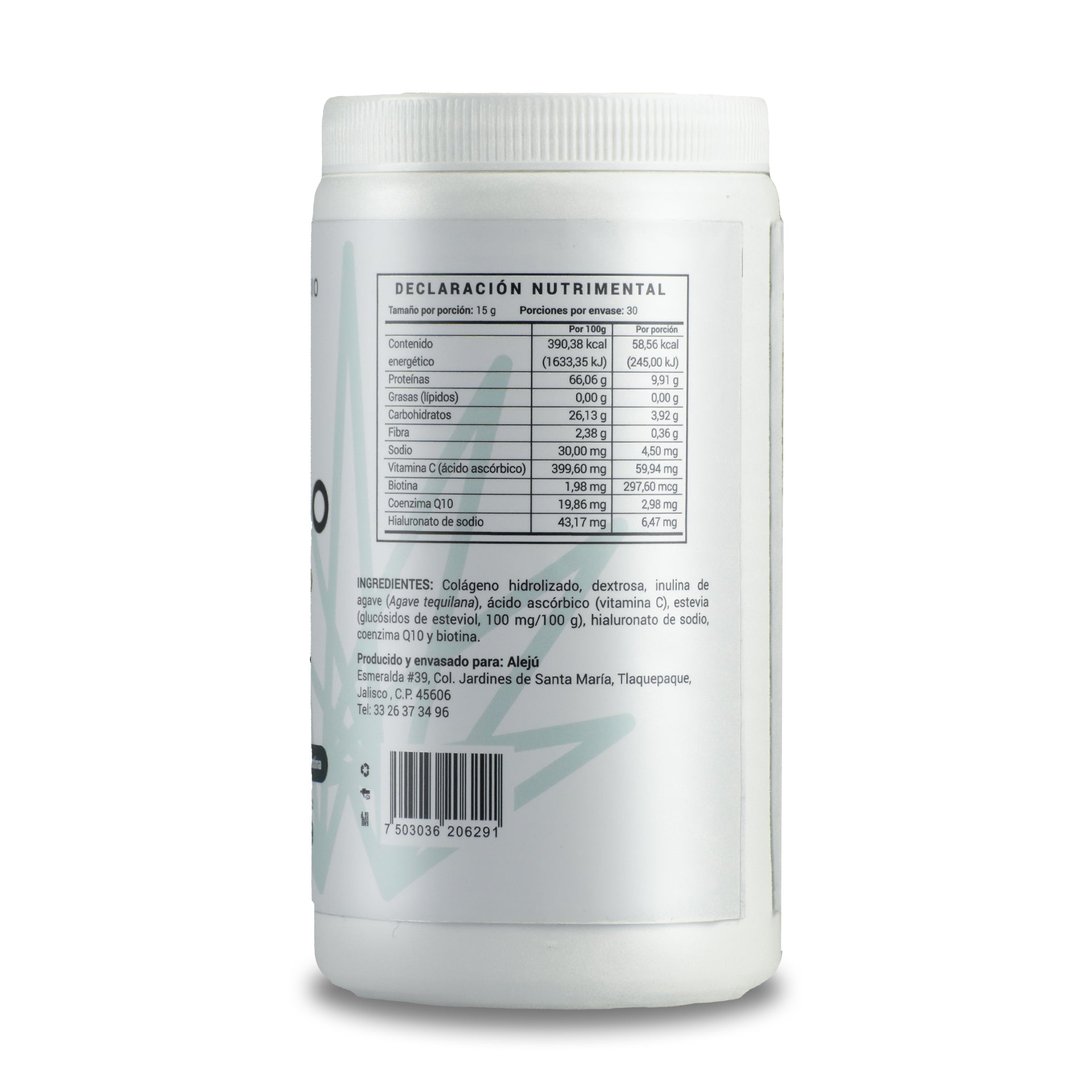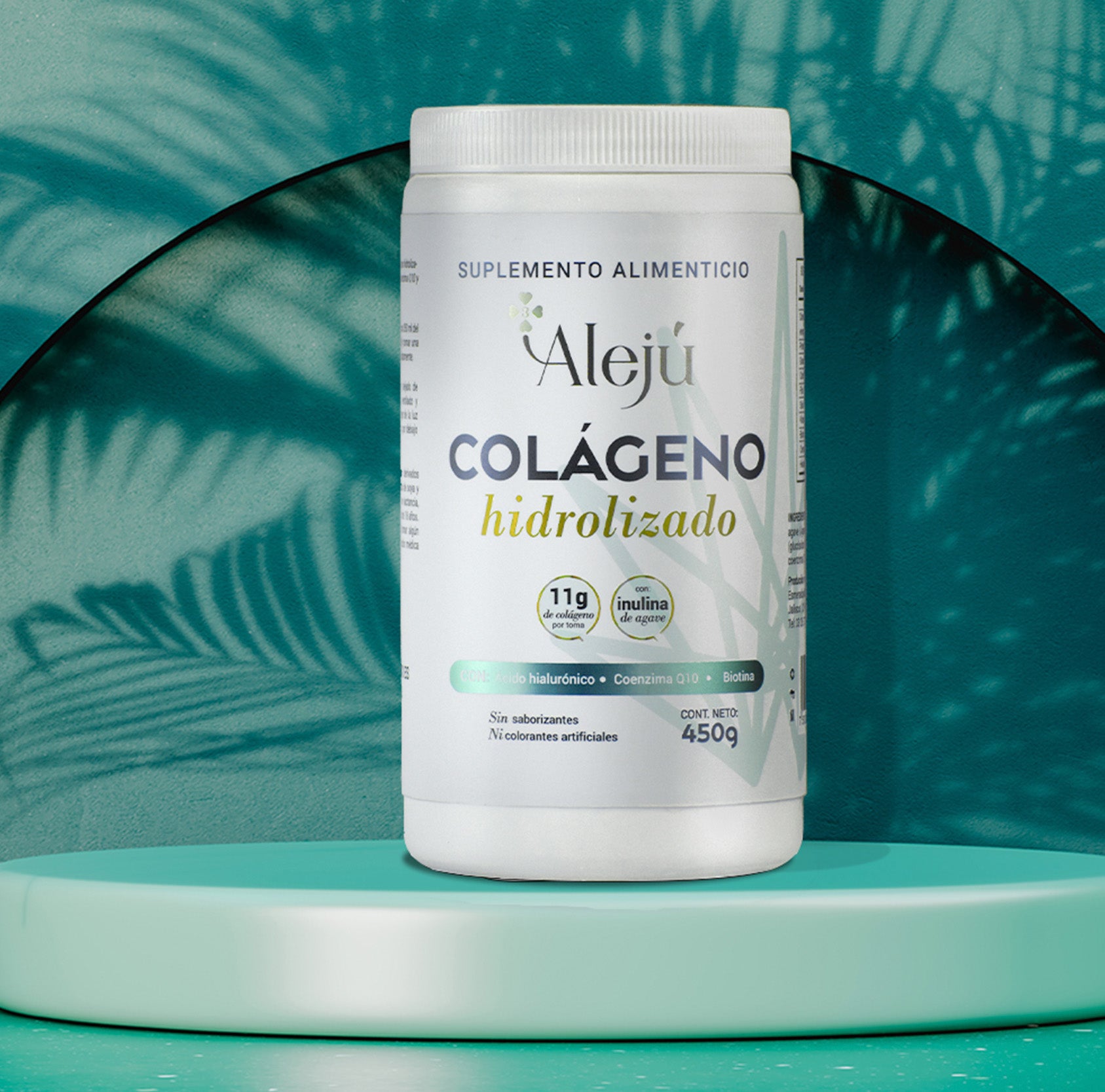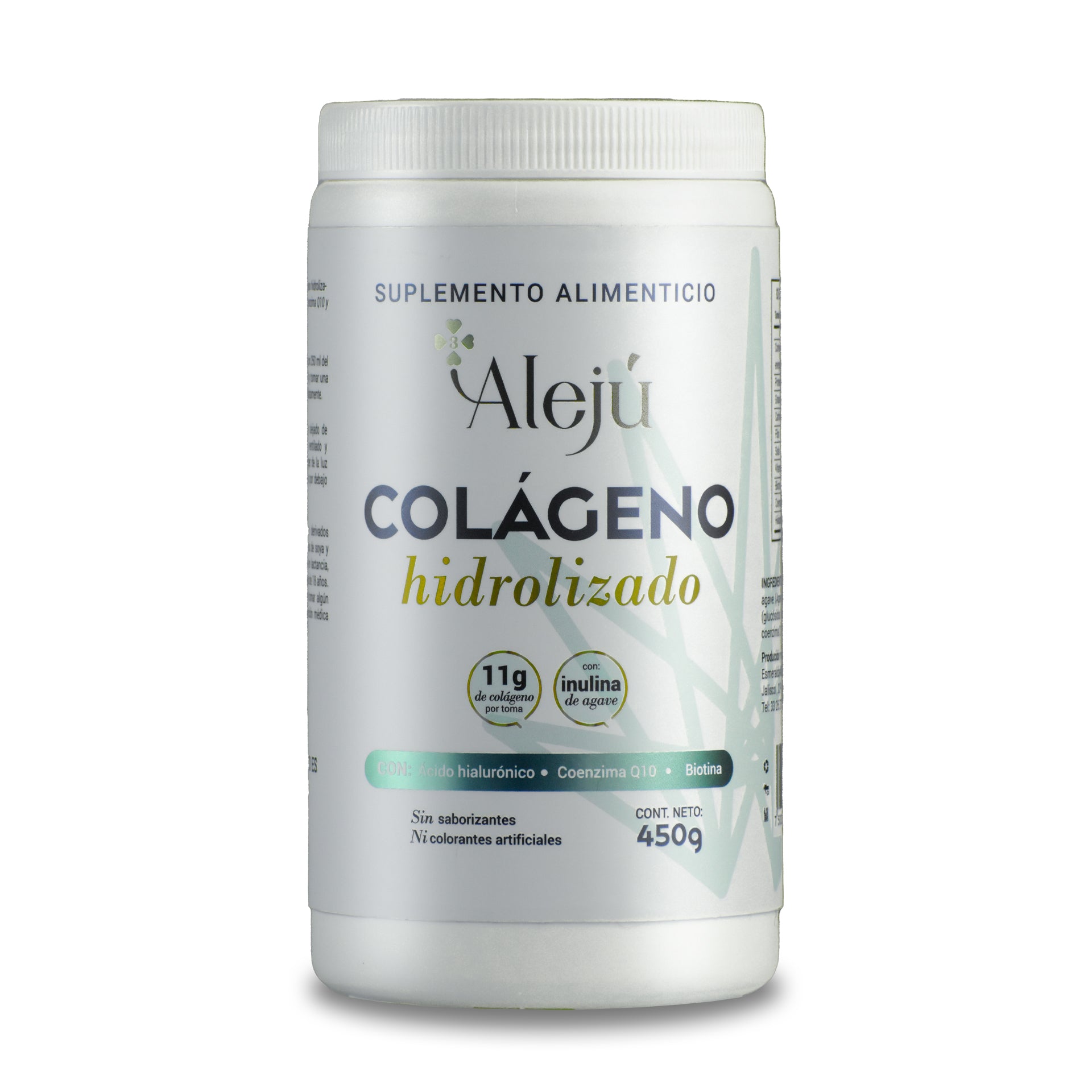 El Colágeno Hidrolizado de Alejú es un suplemento que aporta 11 g de colágeno por porción, enriquecido con inulina de agave, ácido hialurónico, coenzima Q10 y biotina. Diseñado para apoyar la salud de la piel, articulaciones y cabello, este producto es libre de saborizantes y colorantes artificiales.