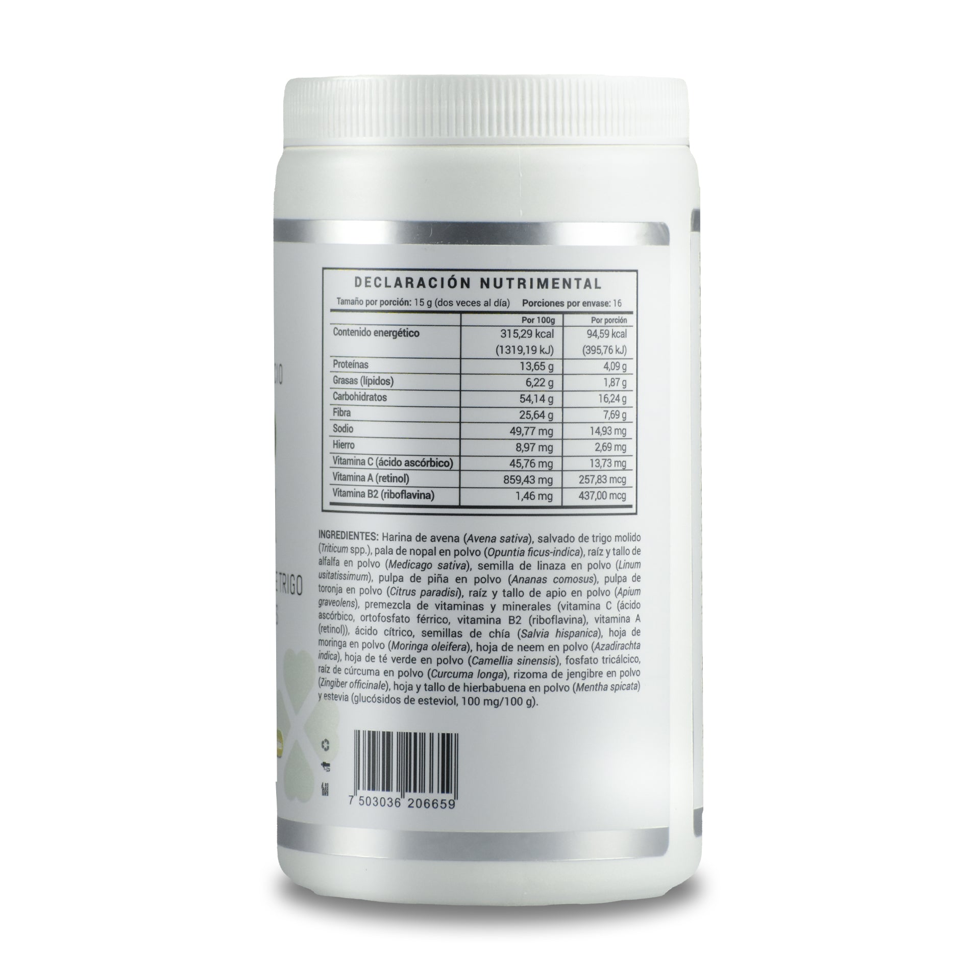 Los ingredientes clave de este producto incluyen harina de avena, rica en fibra que apoya la salud cardiovascular y regula el azúcar en sangre; salvado de trigo, que favorece el tránsito intestinal; pala de nopal, que ayuda a reducir el colesterol y regula los niveles de glucosa en sangre; raíz y tallo de alfalfa, fuente de vitaminas A, C y K, ideales para desintoxicar y remineralizar el cuerpo; semilla de linaza, rica en omega-3 y fibra que mejora la digestión y salud intestinal; pulpa de piña y toronja, que ayudan en la digestión, aportan vitamina C y propiedades antioxidantes; raíz de cúrcuma, potente antiinflamatorio y antioxidante que favorece la detoxificación hepática; rizoma de jengibre, que mejora la digestión y tiene propiedades antiinflamatorias; hoja de té verde, que aumenta el metabolismo y combate los radicales libres; y hierbabuena, que refresca y calma el sistema digestivo.